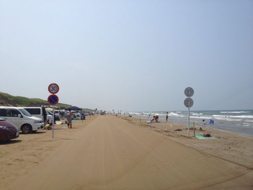 千里浜なぎさドライブウェイでは砂浜を車で走ることができます。こんな感じで砂浜に道路標識も設置されています。
