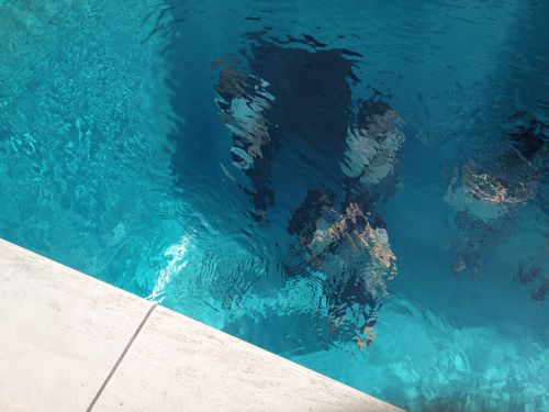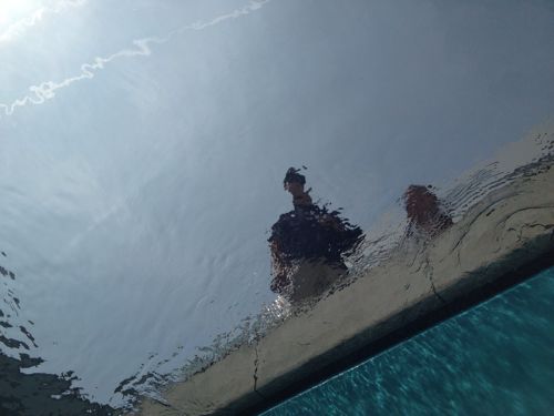 おおっ。プールの中に人がいるように見える! 透明のガラスの天井の上に10cmくらいの深さの水が貼ってあるのでした。