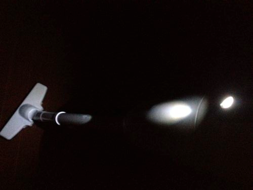 14.4V以上のCLシリーズにはLEDライトがついています。さすがにこんな暗闇の中ではこんな感じになっちゃいますが、家具の後ろの暗い場所などを照らしながら掃除することができて、地味に便利だと思います。LEDライトは掃除機がONになっている時は周りが明るかろうが暗かろうが勝手に光っています。