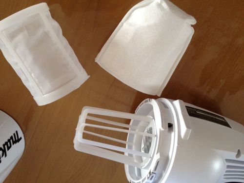 フィルタ類を外したところ。左上がプレフィルタ、右上がフィルタです。カプセル式の消耗品はこの2つ。洗って乾かして使えるのでそんなに頻繁に交換する必要はありませんが、いくつかストックしておきたいところです。