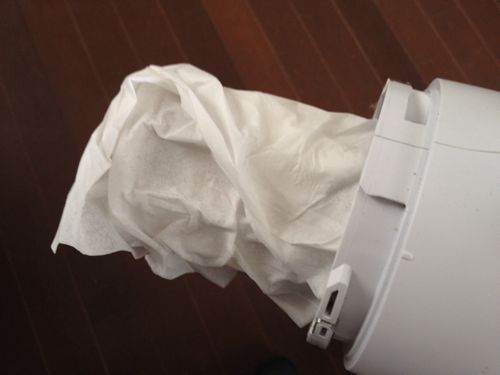 これが、上のほうで書いていた、フィルタを長持ちさせる裏ワザです。プレフィルタの外側にティッシュを2枚被せて包みます。結構テキトウでいいです。トリガを押して風を吸い込みながら貼り付けてカプセルを閉めると簡単です。